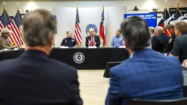 Donald J. Trump y Greg Abbott asisten a una sesión informativa de seguridad con funcionarios estatales y agentes de la ley en la sede del DPS del Departamento de Seguridad Pública de Weslaco.