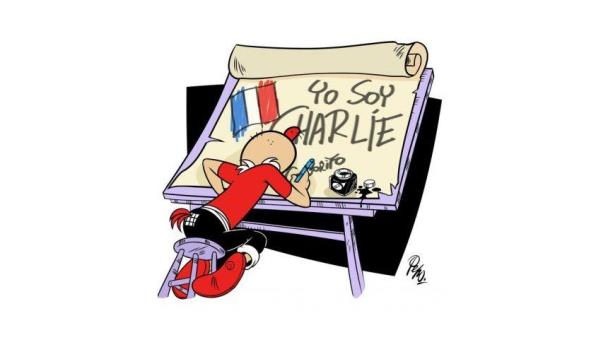 En la imagen se observa al conocido personaje creado por el dibujante chileno René Ríos (Pepo) sentado ante una mesa de dibujo donde se encuentra una hoja donde está escrito “Yo soy Charlie” junto a una bandera de Francia.