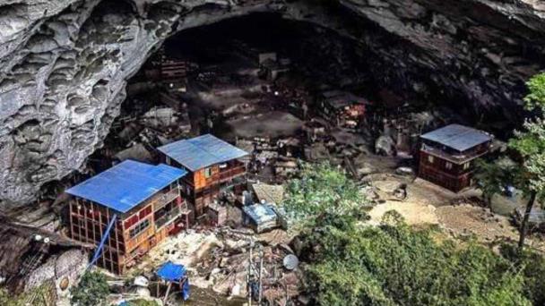La cueva es tan grande que las residencias de madera o bambú forman una aldea subterránea construida a lo largo de sus paredes onduladas.