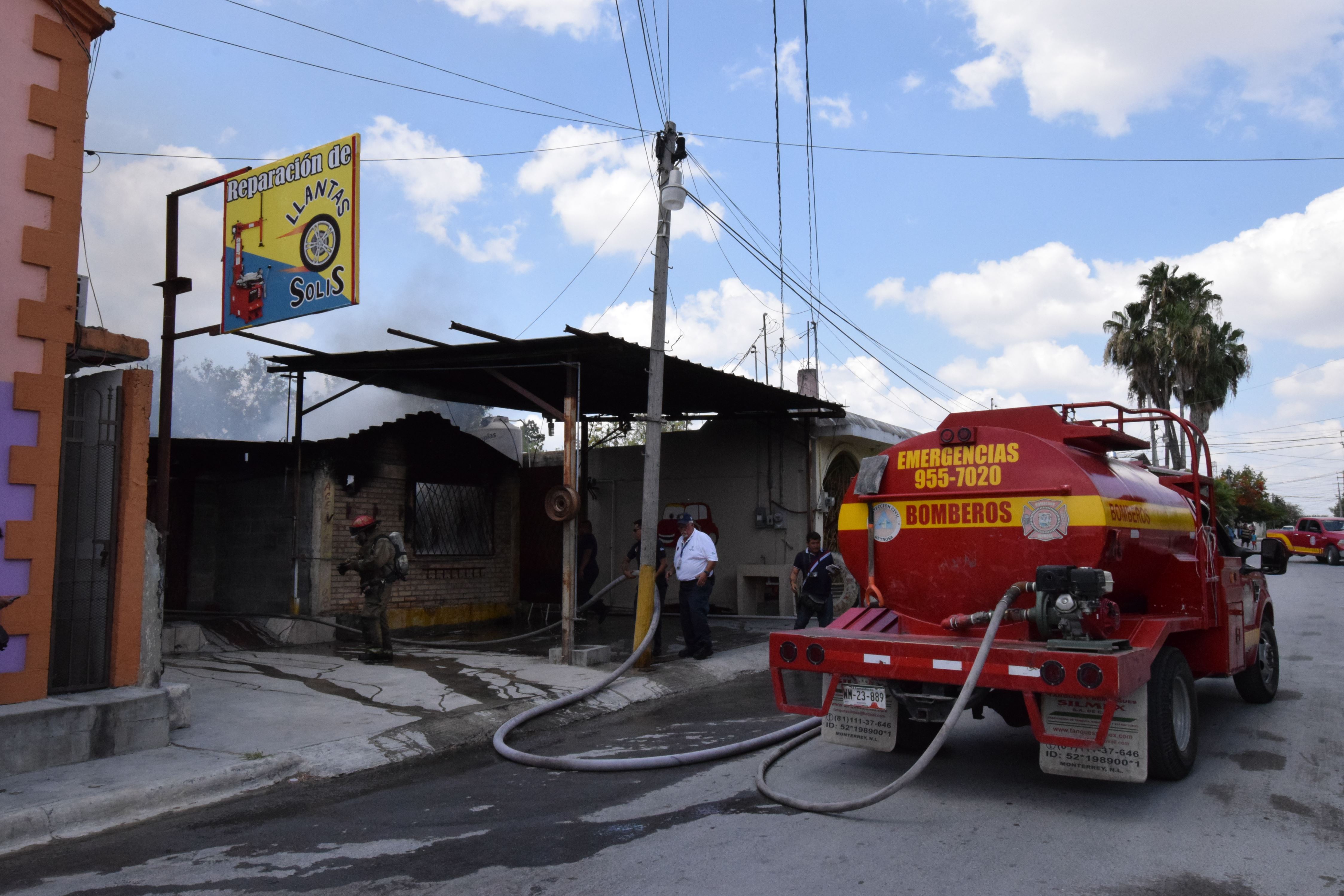 Negocio. Personal de Protección Civil y Bomberos atendió el incendio en la llantera Solís.