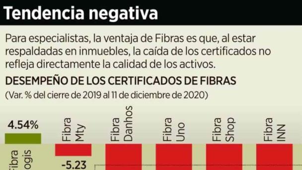 Añadió que las Fibras más diversificadas serán las más resilientes el próximo año. En 2020, las fibras inmobiliarias tuvieron un balance negativo en general en los precios de sus certificados, pero por segmentos, las industriales reportaron un mejor comportamiento. Por ejemplo, el precio de los títulos de Fibra Prologis, que tiene activos industriales, creció 4.54 por ciento en el año, pero los de Danhos, con comercios, cayeron 14.4 por ciento, y Fibra Shop, con oficinas, bajaron 29.7 por ciento.