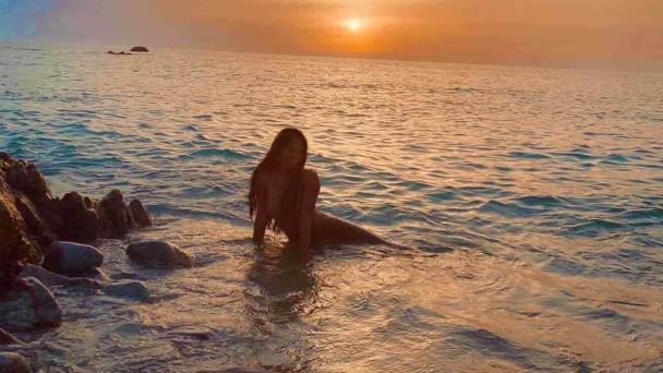 La también cantante compartió su mensaje junto a una foto de sí misma sentada en el océano frente a una puesta de sol, simulando una escena del largometraje.