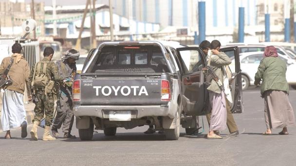SE IMPONEN. Rebeldes chiítas yemeníes, conocidos como huthis, revisan vehículos en las calles cercanas al Palacio Presidencial hasta donde han llegado, en Sanaá.