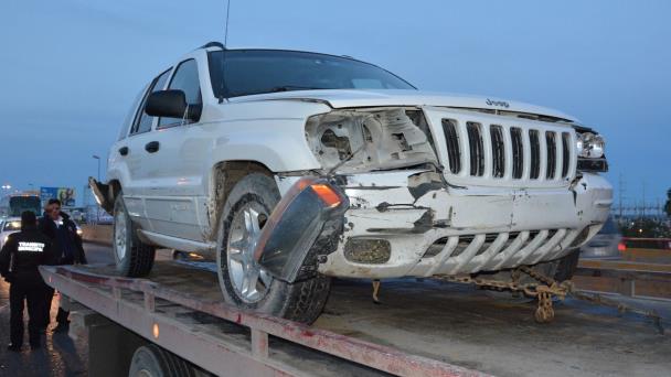 Por lo que al llegar los peritos viales encontraron una camioneta Jeep Grand Cherokee, modelo 2002, de color blanco, con placas de circulación 808-TPS-4, chocada contra el muro de concreto del puente y abandonada por su conductor.