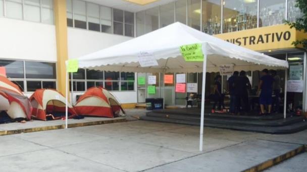 Los estudiantes instalaron un toldo y casas de campaña en las que pasan la noche por turnos mientras mantienen tomadas las oficinas por quinto día consecutivo y así continuarán hasta que sus demandas sean atendidas.