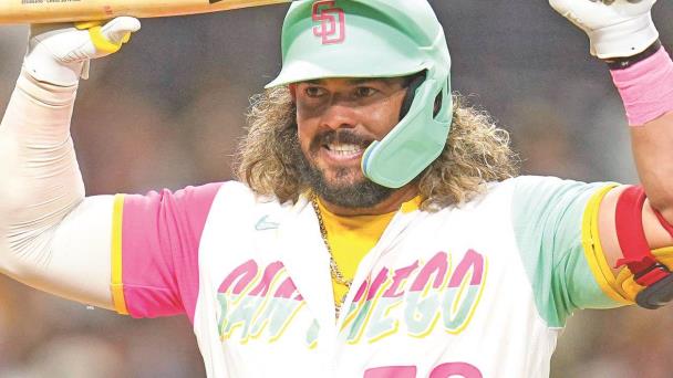 El colombiano Jorge Alfaro, de los Padres de San Diego, reacciona después de ser ponchado durante la sexta entrada de un juego de béisbol contra los Nacionales de Washington, el 19 de agosto de 2022, en San Diego. Los Nacionales de Washington acordaron un contrato de un año con el receptor colombiano Jorge Alfaro el martes.