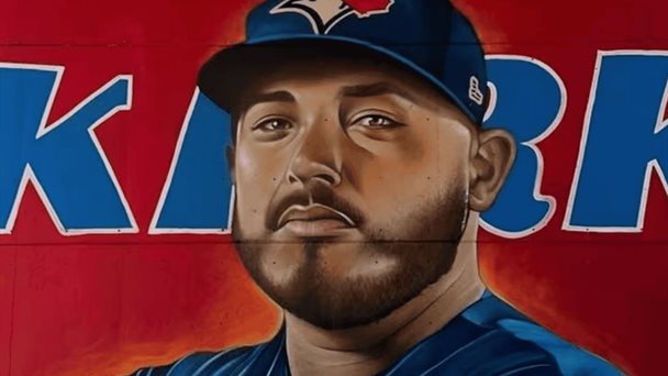 El apellido Kirk y el rostro del estelar de los Blue Jays con un fondo rojo cubren una pared de su natal Baja California.
