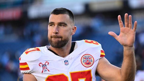 Travis Kelce, de los Chiefs saluda a los aficionados mientras se retira del campo tras el juego anteTitans.