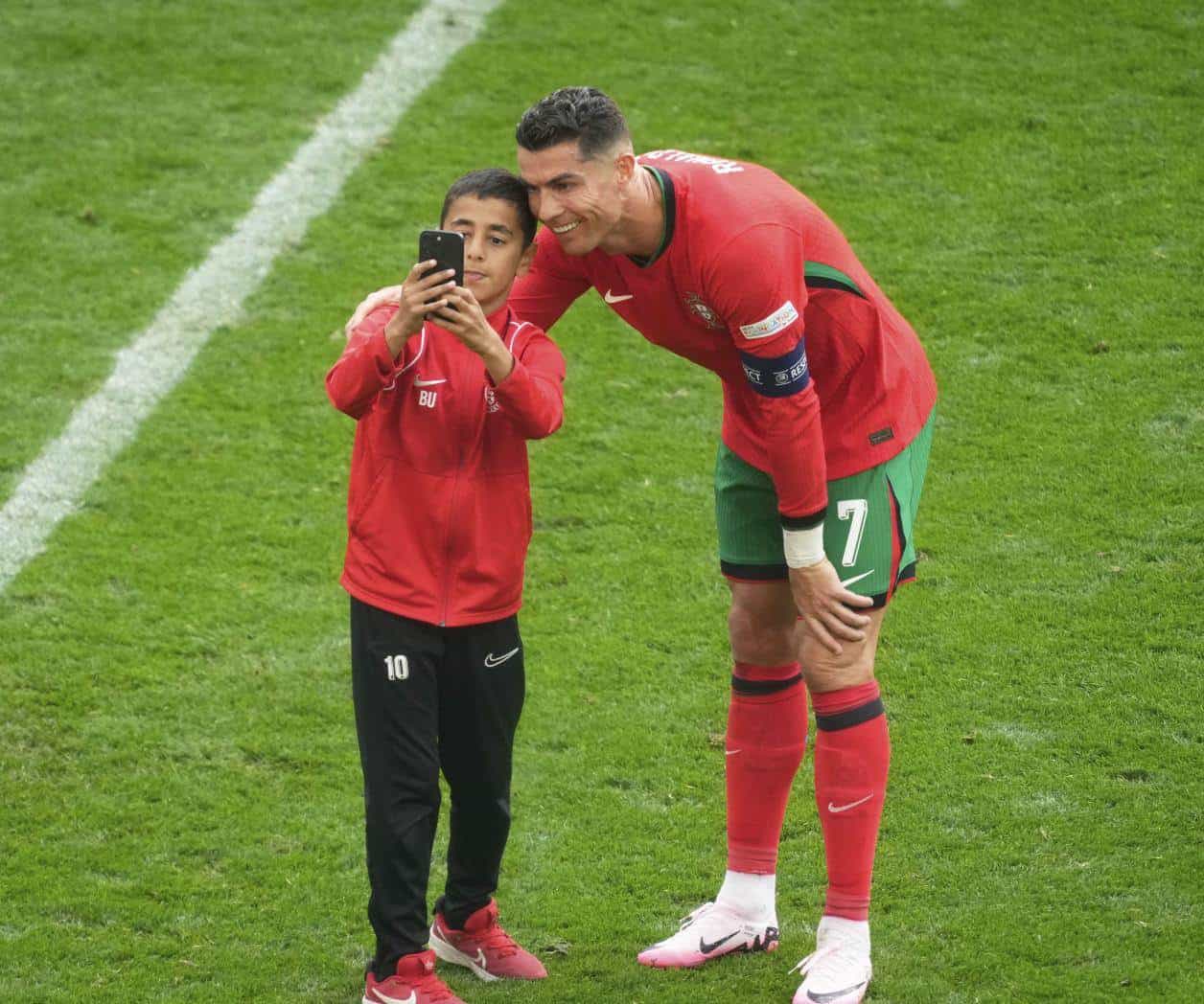Un niño invadió el campo del Signal Iduna Park durante el encuentro entre Portugal y Turquía y pudo llegar hasta CR7, que sin muchos problemas sonrió para fotografiarse con él antes de que los elementos de seguridad lo retiraran de la cancha, dejando una postal única y un recuerdo que seguramente jamás olvidará.