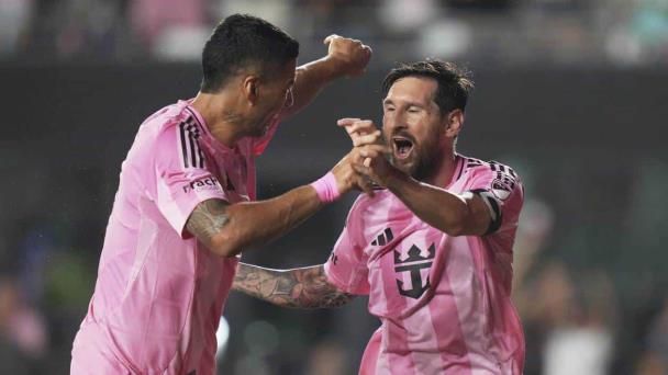 El argentino Lionel Messi festeja con el uruguayo Luis Suárez, su compañero en el Inter Miami, en un partido de la MLS ante Nashville, el sábado 12 de julio de 2025.
