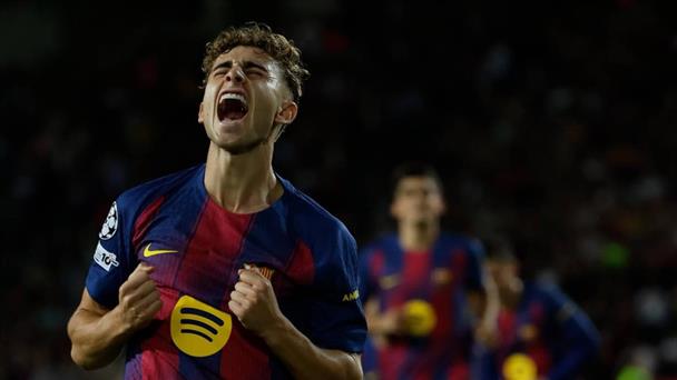 Fermín Lopez del Barcelona celebra tras anotar el quinto gol de su equipo en el encuentro de la Liga de Campeones ante el Olympicados el martes 21 de octubre del 2025.