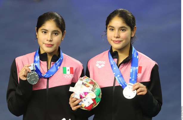 Plata en casa y para la historia. Histórico resultado para las hermanas Mia y Lia Cueva, quienes suben al podio por la medalla de plata con 298.08 puntos en trampolín 3m sincronizado en la Copa del Mundo de Clavados. Logran la hazaña en su ciudad natal, Guadalajara. -PUBLICÓ EL COMITÉ OLÍMPICO MEXICANO EN REDES SOCIALES