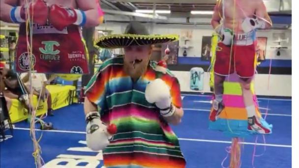 Jake, quien ostenta marca profesional de 11-1 y siete victorias por nocaut, se puso un jorongo multicolor y un sombrero de charro, además de colocarse un bigote para grabar el video donde le da varios golpes a las pinatas.