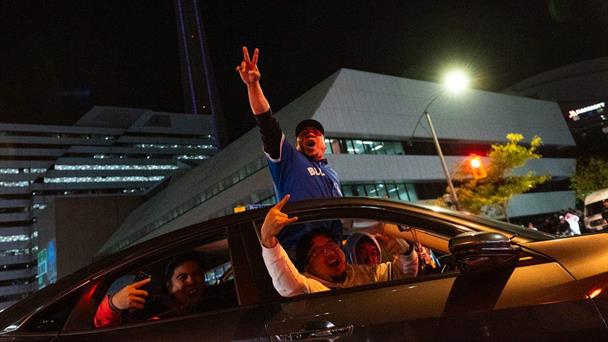 En un juego de la NHL en Calgary, Alberta —a más de 3.000 kilómetros al oeste de Toronto— el locutor del estadio de los Calgary Flames actualizó a la multitud con el jonrón de tres carreras de George Springer en la séptima entrada sobre Seattle, lo que provocó vítores estruendosos.