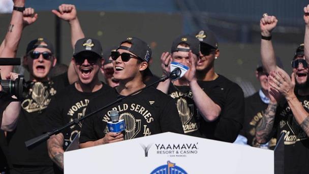 "Hola, hola", dijo Ohtani, hablando en inglés frente a un abarrotado Estadio de los Dodgers. "Quiero decir que estoy muy orgulloso de este equipo. Quiero decir que ustedes son los mejores fanáticos del mundo. Estoy listo para conseguir otro anillo el próximo año. Vamos".