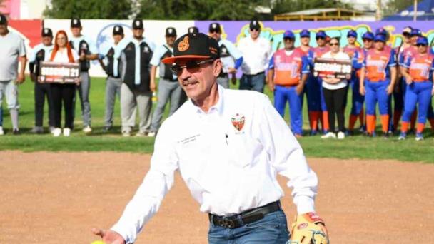 Juan Antonio Treviño Vega, secretario general de la Sección 36, realizó el lanzamiento de la primera bola en la inauguración en las Jornadas Deportivas de Softbol.