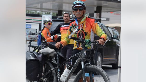 En su paso por Reynosa, el famoso ciclista ´Matusalén´ completó el octavo día rodando en un recorrido de 4,256 kilómetros de Piedras Negras, Coahuila, a Belice