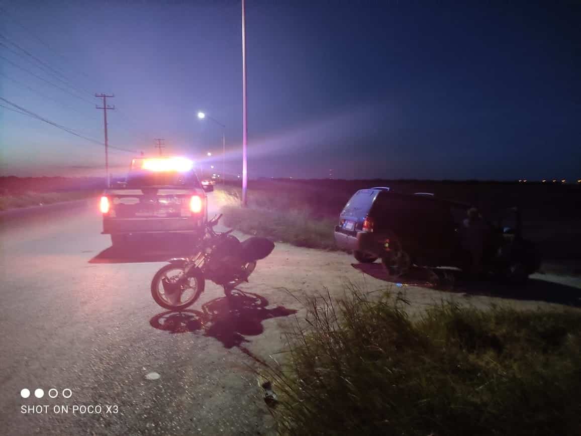 Río Bravo, Tam.- Saldo de un motociclista herido y considerables daños materiales, fue el resultado de un accidente vial que tuvo lugar la noche del viernes en la brecha 112 con dren Río Bravo, en donde también participó una camioneta.
