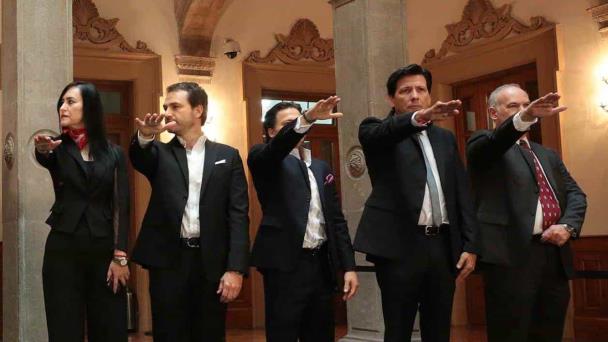 NOMBRAMIENTOS. Norma Leticia Platas (izquierda) rinde protesta al frente de Fuerza Civil, en compañía de funcionarios designados en otras dependencias.