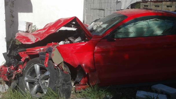 El accidente se registró ayer a las 09:00 horas a la altura del kilómetro 80.500 en la carretera 120, cuando un auto desconocido perturbó el camino del Mustang y este se descontroló por completo, saliendo de la carretera para impactarse contra la barda de una conocida empresa de Gas LP.