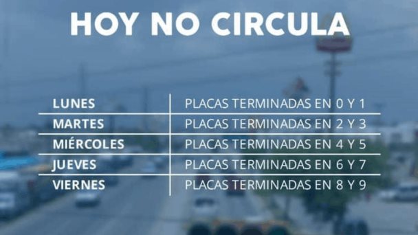 Este lunes 10 de agosto, no pueden circular los vehículos cuyas placas terminen en los números 0 y 1, secuencia que continúa con la restricción a los autos que porten los dos números siguientes por cada día de la semana. En este orden, los martes corresponden a los números 2 y 3; miércoles 4 y 5; jueves 6 y 7, y viernes 8 y 9, observando su cumplimiento, autoridades de los tres niveles de gobierno.