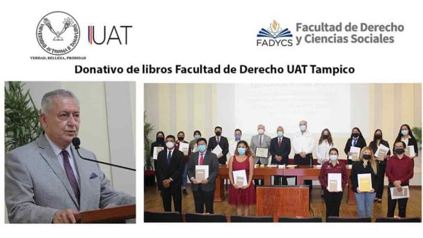 Tampico, Tam.- La Facultad de Derecho y Ciencias Sociales (FADYCS) de la Universidad Autónoma de Tamaulipas (UAT) en Tampico llevó a cabo la ceremonia de entrega simbólica de más de trescientos libros por parte del magistrado Noé Adonai Martínez Berman, padrino de la generación 2021-1 de egresados de licenciatura y maestría de este plantel universitario.
