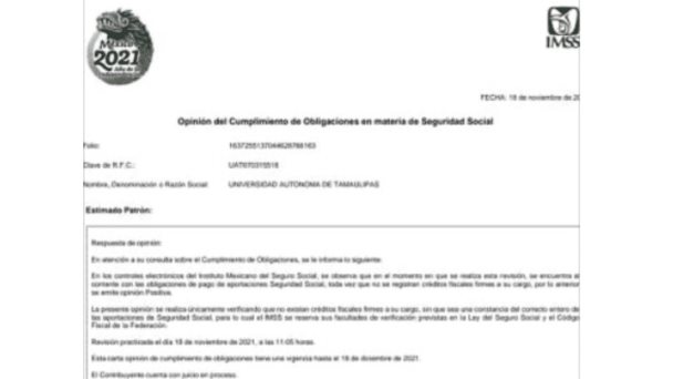 La Universidad Autónoma de Tamaulipas recibió una carta oficial de no adeudos fiscales por concepto de cuotas y aportaciones, aclarando información circulada en sentido de que la casa de estudios padecía por adeudos ante el instituto de seguridad social