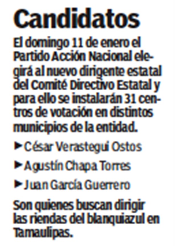 Instalarán 31 centros de votación uno de ellos en esta ciudadEn este mes, el Partido Acción Nacional elegirá al nuevo dirigente del Comité Directivo Estatal (CDE) en Tamaulipas e iniciará el proceso interno para seleccionar al candidato que los representará en la contienda electoral que se celebrará el próximo 7 de junio para renovar la cámara de diputados federales.