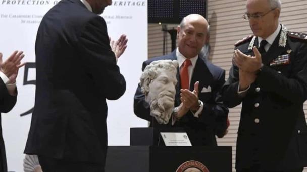 El embajador Lewis Eisenberg entregó la cabeza de mármol del dios antiguo Pan al ministro de Cultura, Dario Franceschini, en el 50 aniversario de una unidad de Carabinieri especializada en la recuperación de antigüedades.