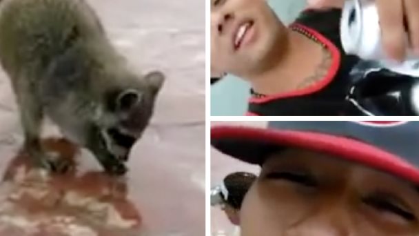 En el video se escucha a dos hombres reír, y dicen 'vamos a darle pisto al mapache', el mapache se acerca y uno de los sujetos le vierte en el suelo cerveza tecate, después comentan entre ellos 'mira ya anda bien pedo'.