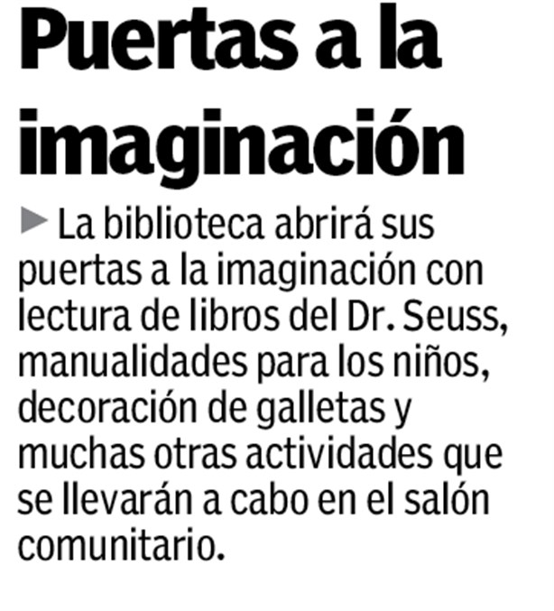 Aunque el cumpleaños del autor es el día de hoy, este jueves 5 de marzo en punto de las 18:00 horas, la biblioteca abrirá sus puertas a la imaginación con lectura de libros del Dr. Seuss, manualidades para los niños, decoración de galletas y muchas otras actividades que se llevarán a cabo en el salón comunitario.
