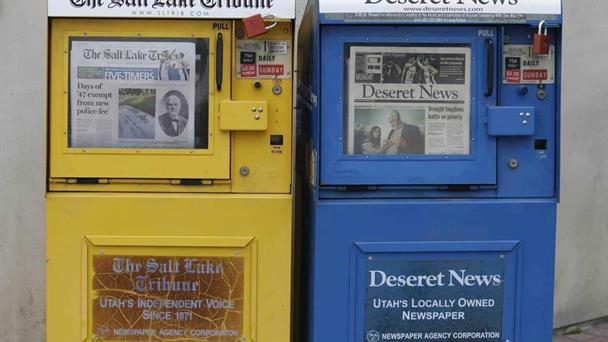 Esta fotografía muestra cajas de venta de los periódicos Salt Lake Tribune y Deseret News, el 16 de junio de 2014, en Salt Lake City.
