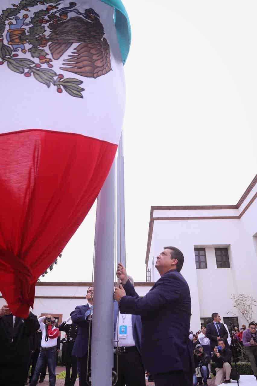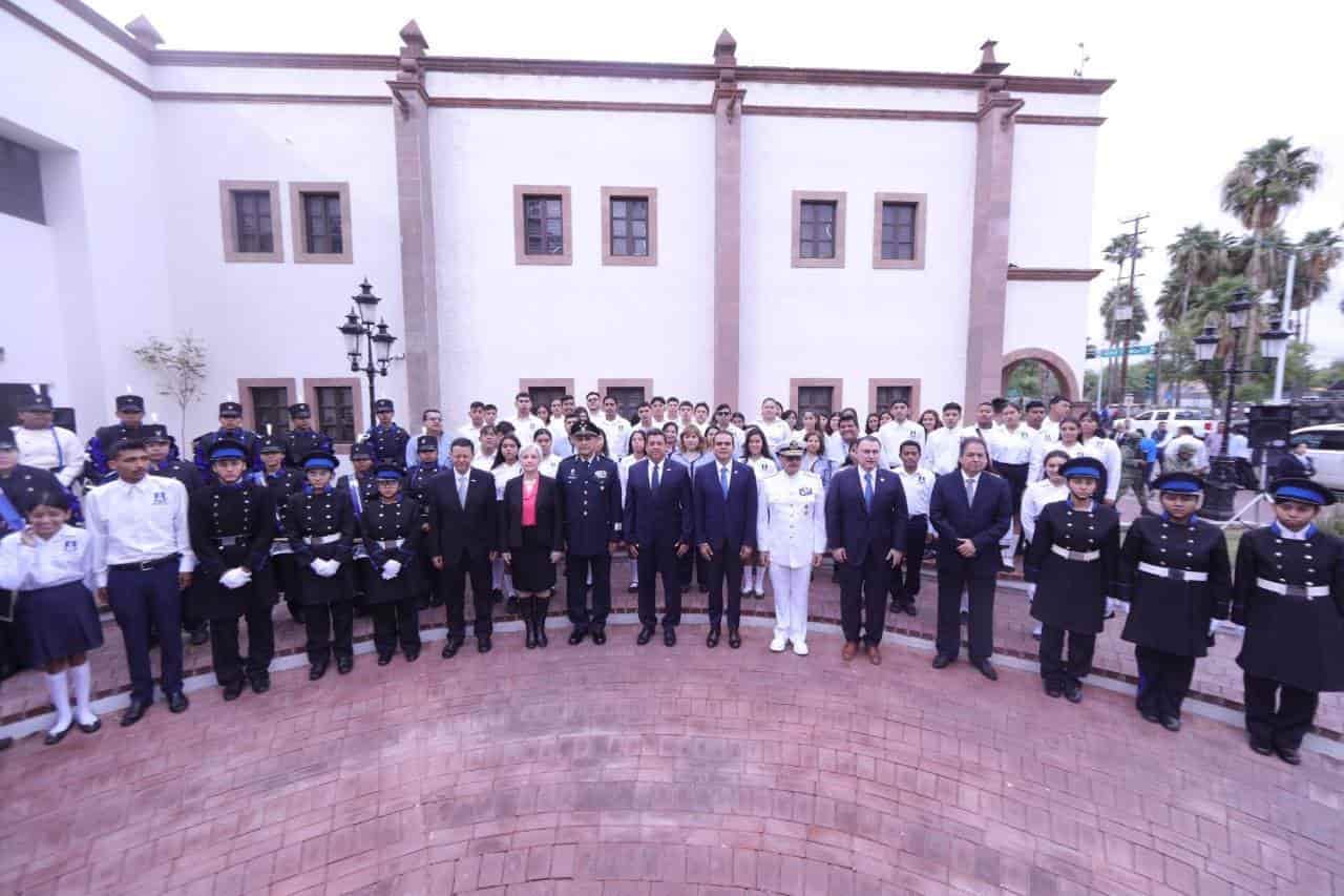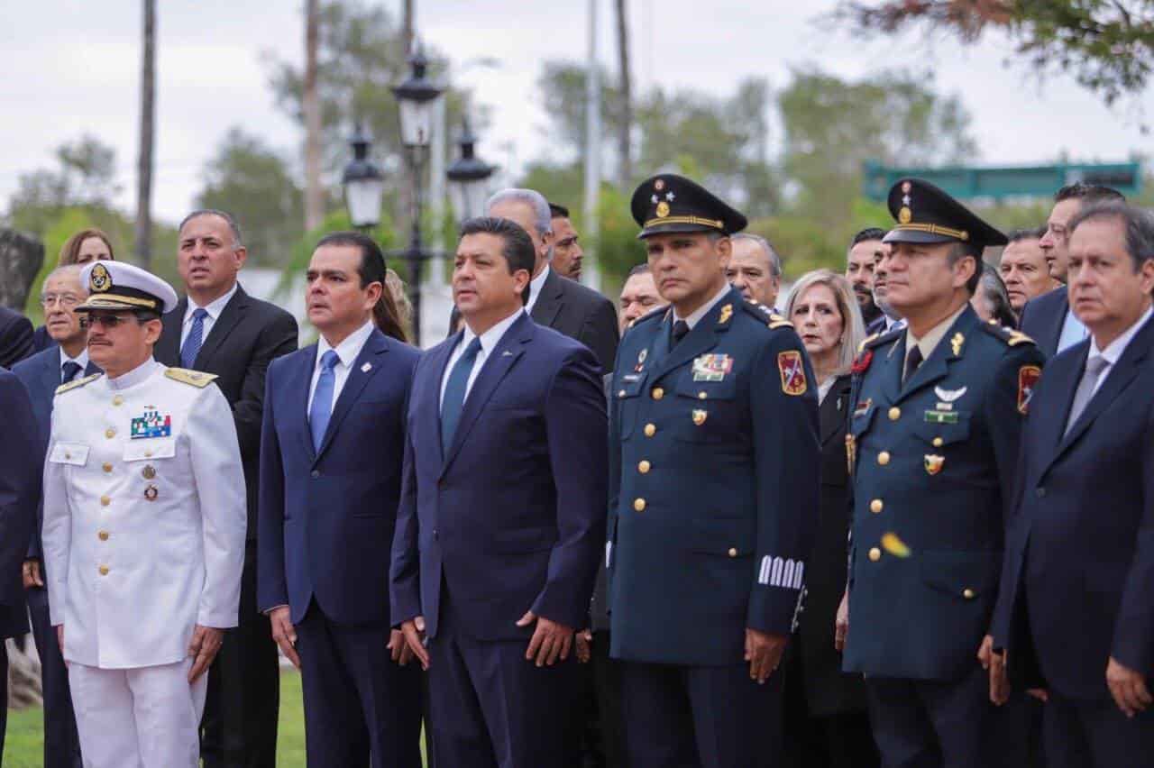En la Plaza Cívica de Nuevo Laredo, se rindieron honores a la Bandera Nacional, previo al desfile, en el que participan Fuerzas Armadas, de Seguridad, instituciones educativas, entre otros contingentes.