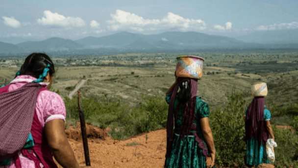 Mujeres zapotecas caminan por la comunidad de San Marcos Tlapazola, en Oaxaca.