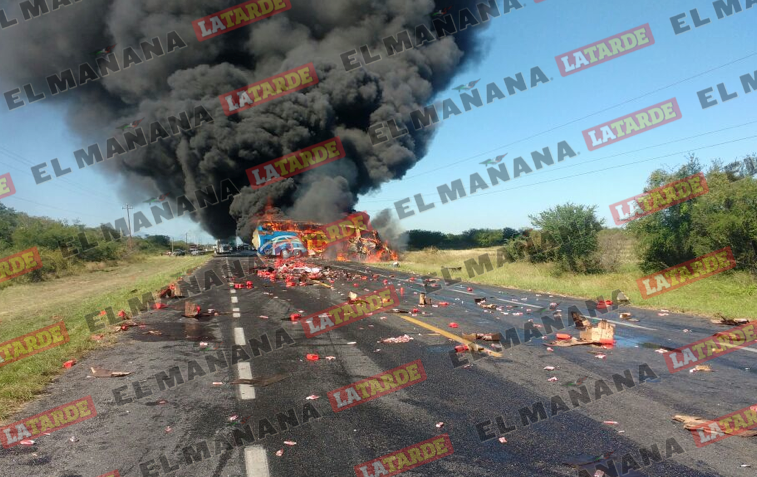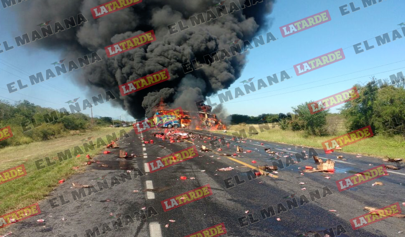 El camión de pasajeros es de la línea Transpaís el cual se incendió después del choque.