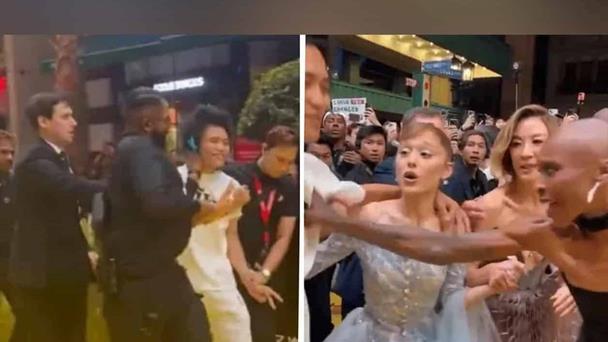 El influencer Johnson Wen, conocido como Pyjama Man, se lanzó sobre Ariana Grande durante la premier de "Wicked" en Singapur.