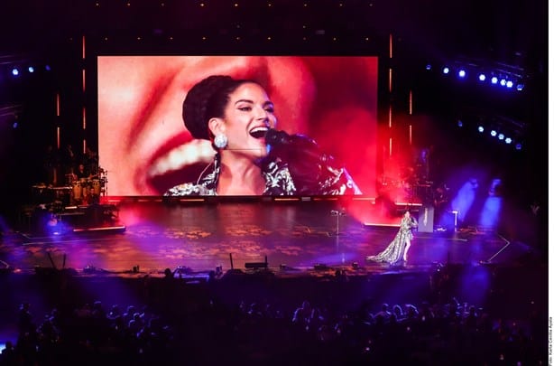 Tras unos minutos de ausencia, Natalia apareció a ritmo de bolero y con un vestido rojo. “Cien años”, “Sabor a mí” y “Perfume de gardenias” evocaron la nostalgia de las voces de antaño. “Oigan, esta canción es una de las más grandes de México”, anunció antes de entonar “Bésame mucho” y luego “Piel canela”, sumergiendo al público en un ambiente de serenata y bohemia.