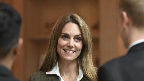 La Princesa de Gales, de 43 años, dejó que su cabello rubio caramelo fluyera libremente mientras lucía un blazer de tweed, una camisa blanca elegante y pantalones de traje oscuros.
