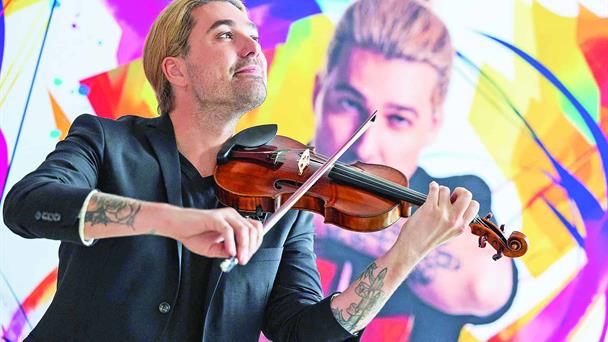 Se escuchan los primeros acordes de su violín y David Garrett aparece sorpresivamente entre el público que, de inmediato, toma su celular para registrar cada instante; de repente él se detiene, posa para la "selfie" y sube al escenario.