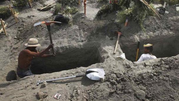 Dos hombres excavan tumbas en el cementerio de Valle de Chalco.