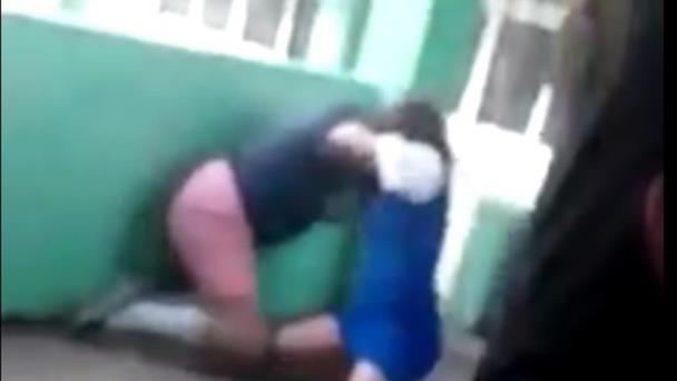 Después de un minuto de la grabación, los compañeros de escuela alientan a las jovencitas a que se continúen golpeando.