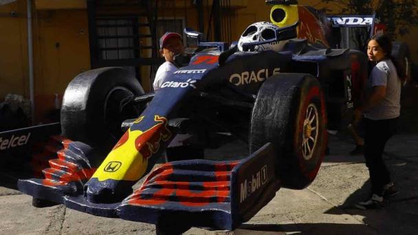 Uno de los autos de Fórmula 1 del equipo de Checo Pérez, Red Bull, ya está en la Ciudad de México... en una réplica de cartón