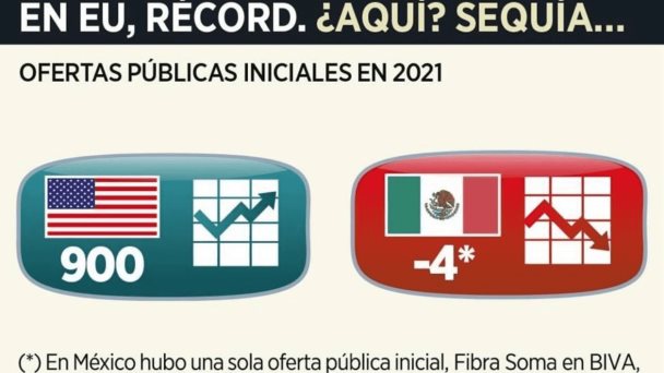 En México la historia es muy distinta. Tan sólo en este año Biopappel, Santander México, Grupo Lala, IEnova y General de Seguros anunciaron que dejarán el mercado de valores, con lo que apenas 140 empresas cotizan actualmente en la BMV. Y la única OPI emitida en 2021 fue en la Bolsa Institucional de Valores (BIVA), el otro mercado bursátil en el País, en febrero, cuando Grupo Sordo Madaleno colocó Fibra Soma.