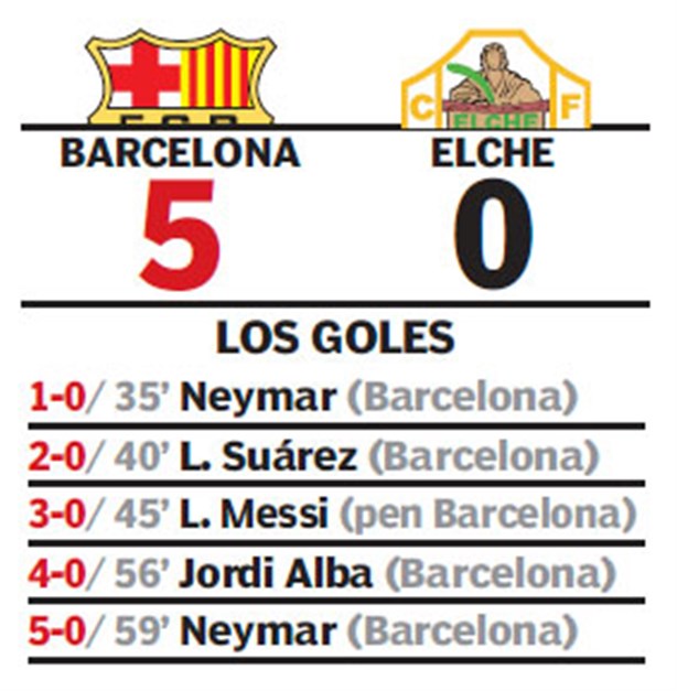Barcelona hizo a un lado momentáneamente su crisis extradeportiva y dio una buena exhibición, que incluyó goles de Neymar, Lionel Messi y Luis Suárez, para apabullar el jueves 5-0 al Elche en la ida de los octavos de final de la Copa del Rey.
