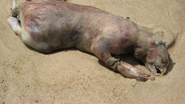 El extraño animal fue encontrado en estado de putrefacción en la playa de Miramar por los paseantes; su aspecto es similar a un perro con cuerpo de cerdo y sus extremidades parecidas a una especie de roedor gigante; animales muy parecidos han sido encontrados muertos en las costas de Nueva York en la última década.
