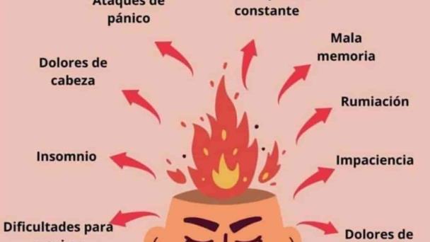 Entre los principales síntomas, destacan: Dificultades para respirar, insomnio, dolores de cabeza, ataques de pánico, preocupación constante, mala memoria, rumiación, impaciencia, etc.
