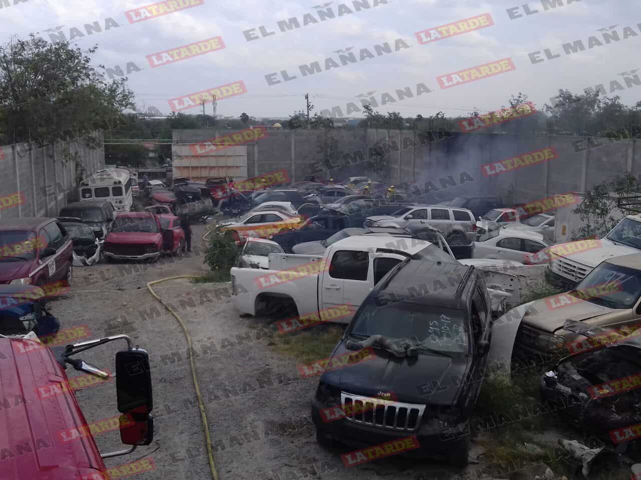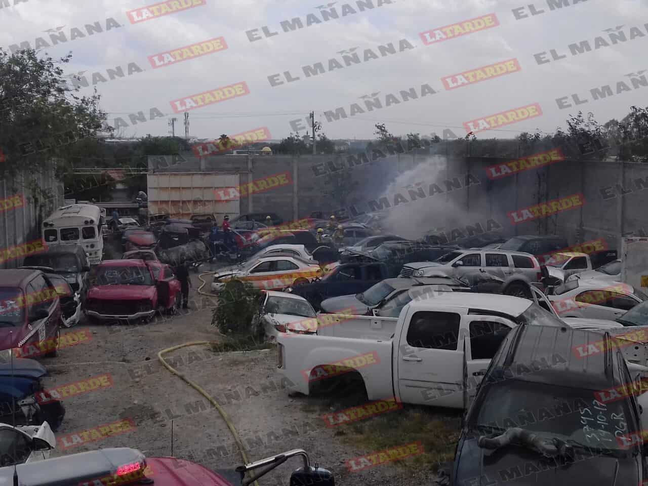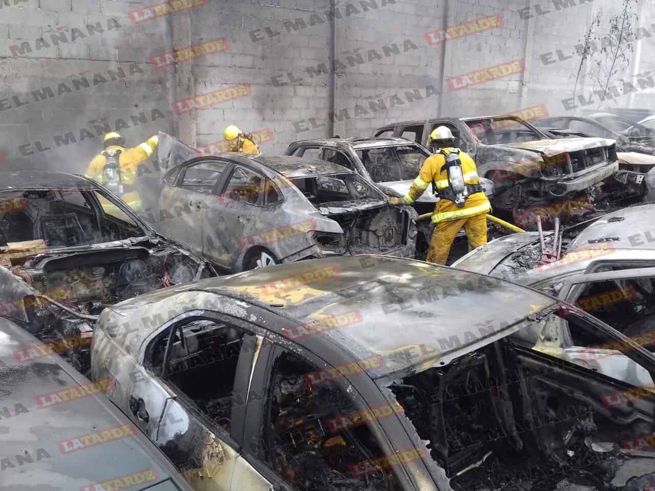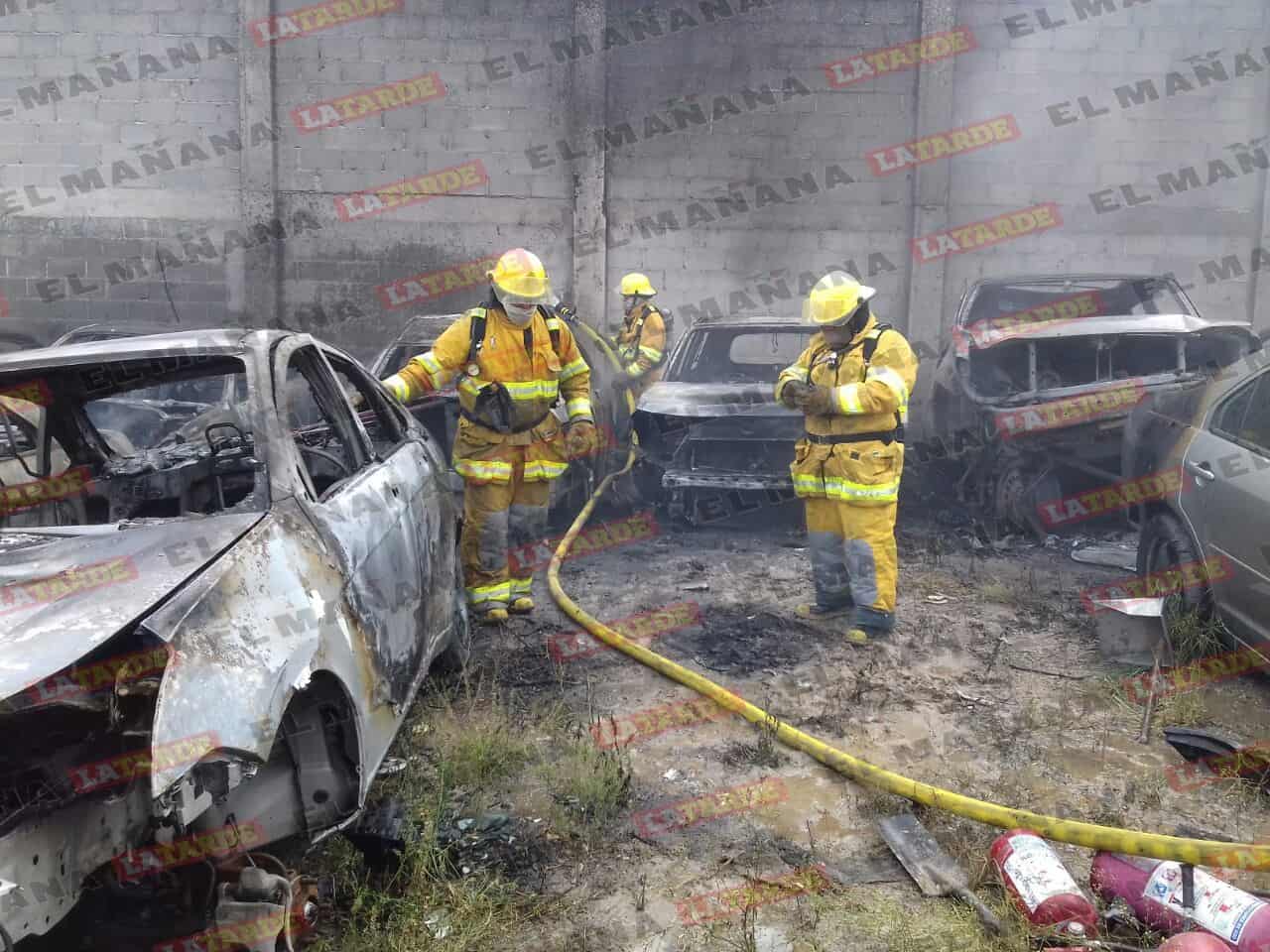 Reynosa, Tam.- Aproximadamente 13 vehículos terminaron destruidos en un incendio registrado en el corralón de MyR.