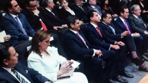 FALLAN. La butaca que estaba destinada para el dirigente nacional del PAN, Damián Zepeda, quedó sin ocupar, justo al lado de la que sí ocupó la lideresa del PRI, Claudia Ruiz Massieu (traje blanco).