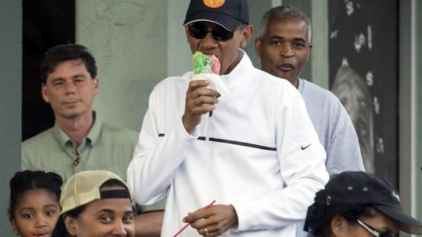 Vestido con ropa informal, Obama pidió su helado con sirope de melón, cereza y lilikoi. Lilikoi es el término local para referirse a la fruta de la pasión.