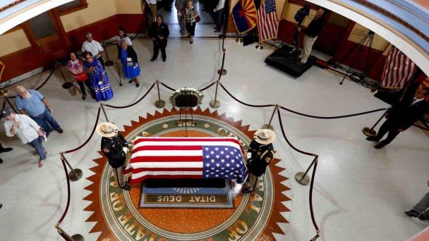 El féretro con los restos de McCain, cubierto con la bandera estadunidense, permanecerá abierto bajo la rotonda a lo largo de este miércoles para que los residentes de Arizona puedan presentar sus respetos durante una visita pública.